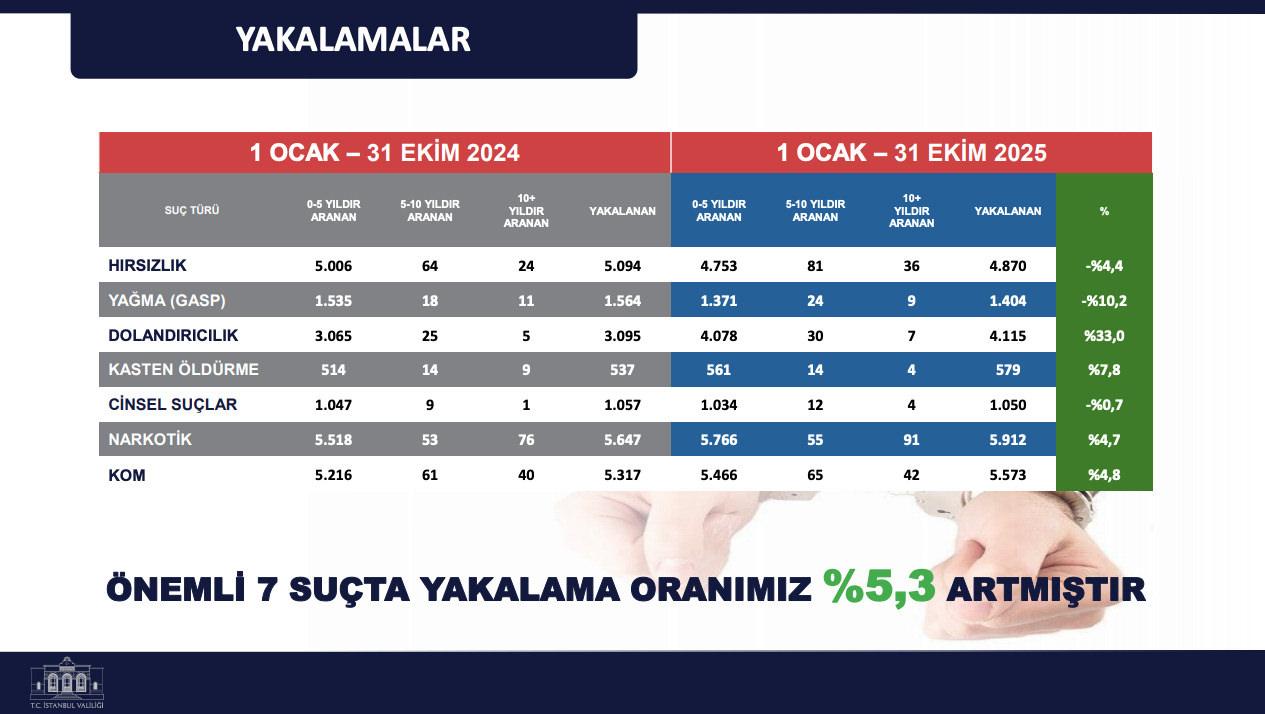 Önemli 7 suç kategorisinde aranan 23 bin 503 kişi yakalandı. Yakalama oranı yüzde 5,3 arttı. Bazı suç türlerinde artış da görüldü. Örneğin dolandırıcılıktan arananların yakalanmasında yüzde 33 yükseliş kaydedildi.