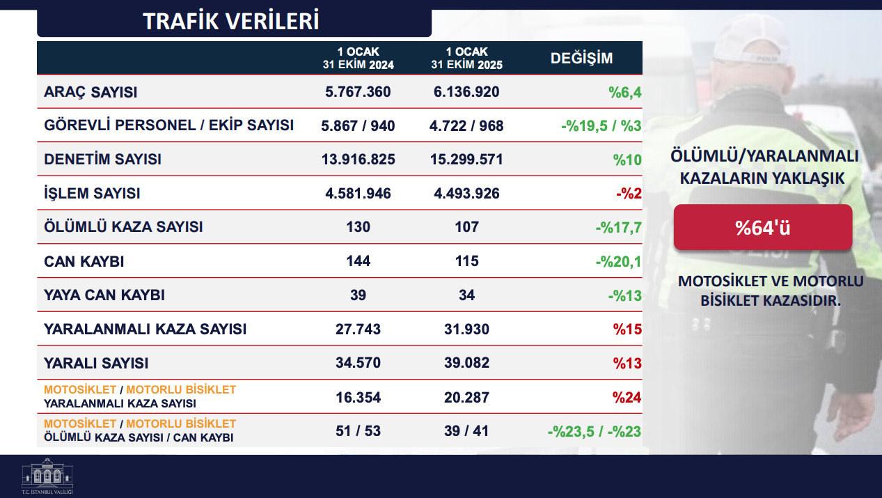 Yaya can kaybı da yüzde 13 azaldı. Motorlu bisiklet ve motosikletlerin kazalardaki ağırlığı dikkat çekti. İstanbul’daki ölümlü-yaralanmalı kazaların yüzde 64’ü motosiklet/motorlu bisiklet kaynaklı oldu.