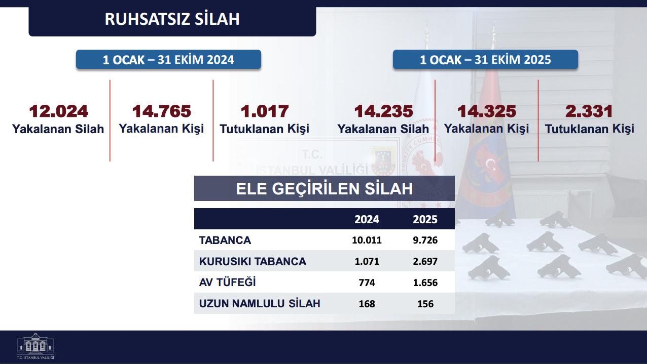Ruhsatsız silahla mücadelede yakalanan silah sayısı yüzde 18,4, tutuklanan şüpheli sayısı yüzde 130 arttı. 2025’in 10 ayında İstanbul’da 14 bin 235 silah ele geçirildi.