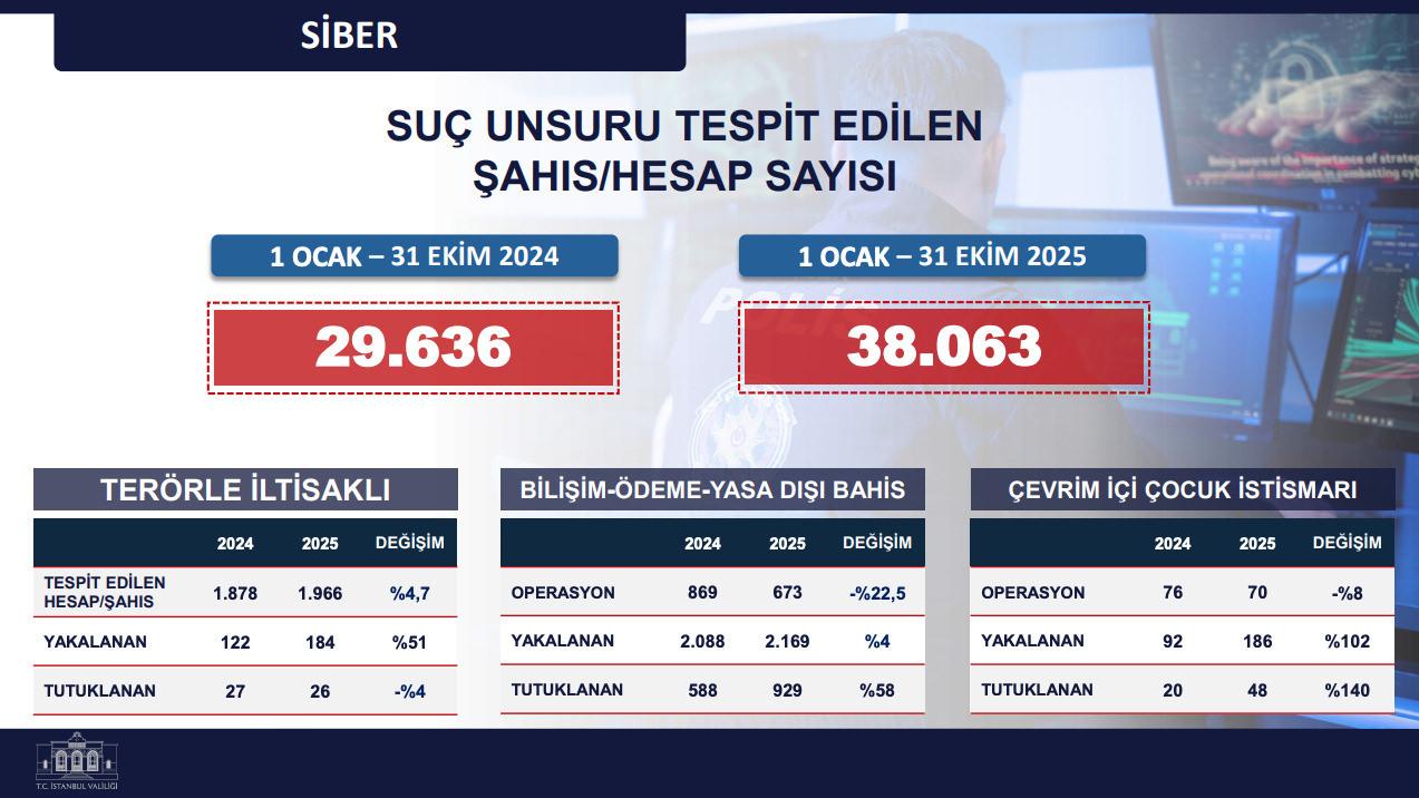 Siber suç alanında terörle iltisaklı hesap tespitleri, yasa dışı bahis ve çevrim içi çocuk istismarına yönelik yakalama ve tutuklamalarda artış kaydedildi. Çevrim içi çocuk istismarında yakalananlar yüzde 102 arttı. Siberde toplam suç unsuru tespit edilen hesap/şahıs sayısı 38 bin 63’e yükseldi.
