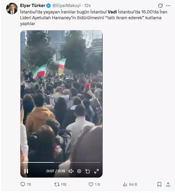 "TATLI İKRAM EDEREK KUTLADILAR"Videoyu paylaşan Elyar Türker isimli kullanıcı, "İstanbul'da yaşayan İranlılar bugün İstanbul Vadi İstanbul'da 16.00'da İran Lideri Ayetullah Hamaney'in öldürülmesini "tatlı ikram ederek" kutlama yaptılar" notunu da düştü.