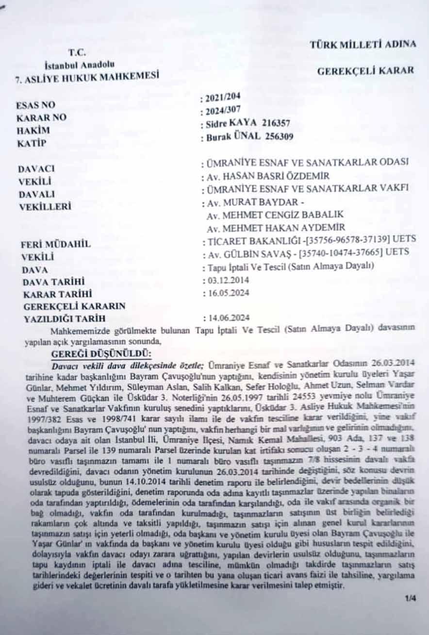 Ümraniye Esnaf ve Sanatkârlar Odası’na ait taşınmazların geçmiş dönemde eski yönetim tarafından usulsüz şekilde vakfa devredilmesine ilişkin açılan tapu iptal ve tescil davası, tüm yargı aşamalarında oda lehine sonuçlandı.