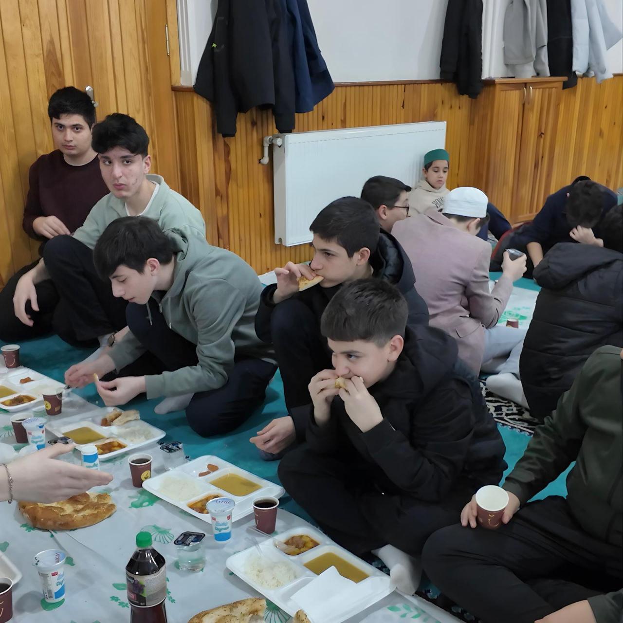 Ramazan ayının paylaşma ve kardeşlik ruhunu yansıtan programda, gençler cami ortamında çorbalarını birlikte içti, yemeklerini paylaştı, pidelerini bölüşerek iftarlarını açtı.