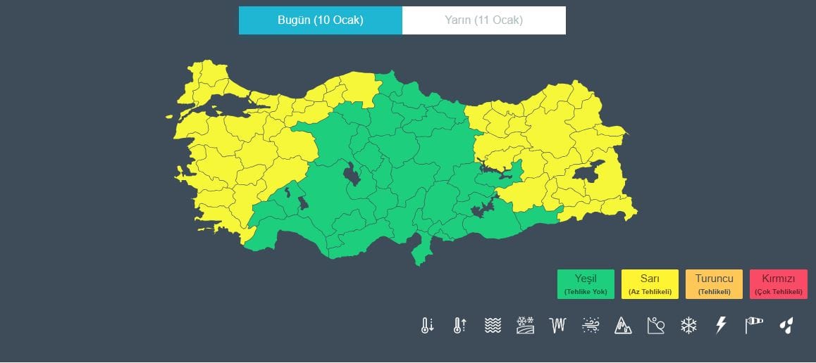 KUVVETLİ YAĞIŞ UYARISI: Yağışların; Marmara'nın güney ve batısı ile Kıyı Ege'de yerel kuvvetli olması beklendiğinden ani sel, su baskını, yıldırım, yerel küçük çaplı dolu ve ulaşımda aksamalar gibi olumsuzluklara karşı dikkatli ve tedbirli olunması gerekmektedir.