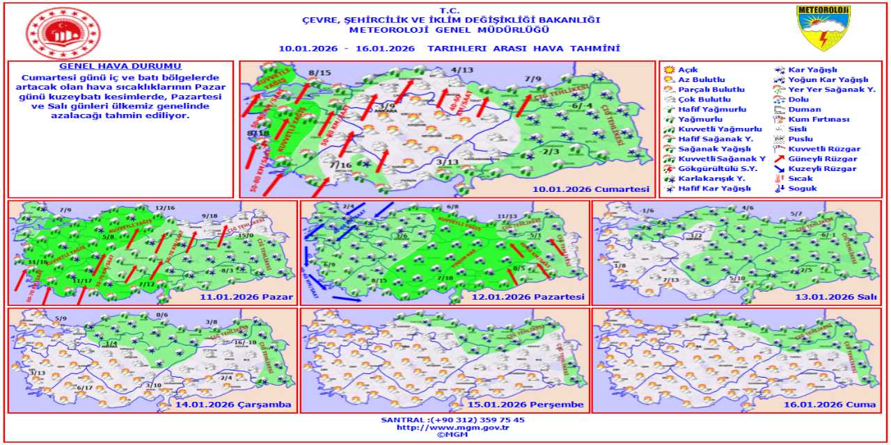 Hava sıcaklığının mevsim normalleri civarında seyredeceği tahmin edilirken Pazar günü düşeceği açıklandı. Rüzgarın genellikle güneyli yönlerden hafif ve orta kuvvette, Marmara, Ege, Batı Akdeniz, İç Anadolu'nun kuzey ve batısı ile Karadeniz'in iç kesimlerinde kuvvetli ve yer yer fırtına (40-80 km/saat) şeklinde esmesi bekleniyor.