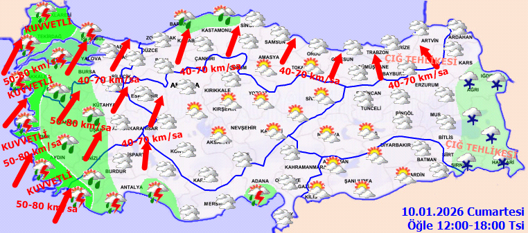 ORTA ve DOĞU KARADENİZParçalı ve çok bulutlu, sabah saatlerinde Ordu, Rize ve Artvin çevrelerinin yağmurlu geçeceği tahmin ediliyor. Rüzgarın; güneyli yönlerden bölgenin iç kesimlerinde kuvvetli ve yer yer fırtına (40-80 km/saat) şeklinde esmesi bekleniyor. Doğu Karadeniz'in yüksek kar örtüsüne sahip eğimli kesimlerinde çığ tehlikesi bulunmaktadır.