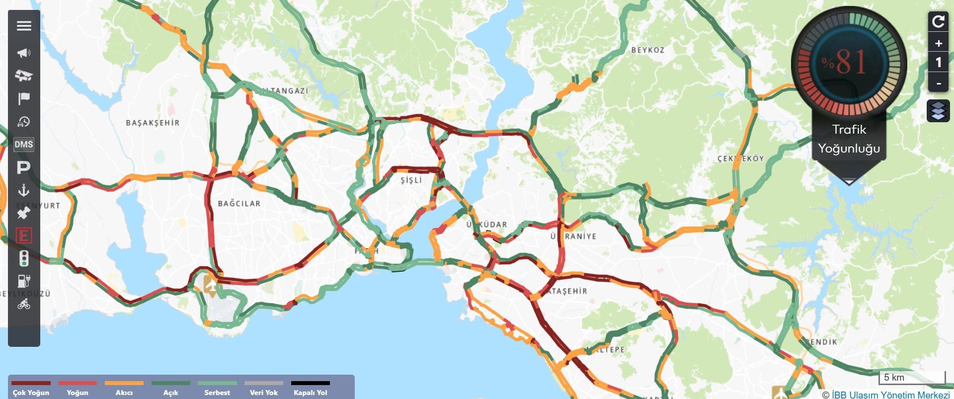 Kaynak: İBB TrafikTRAFİK YOĞUNLUĞU YÜZDE 81'E ULAŞTIİstanbul Büyükşehir Belediyesi'nin CepTrafik uygulaması verilerine göre, kent genelindeki trafik yoğunluğu yüzde 81'e kadar çıktı.