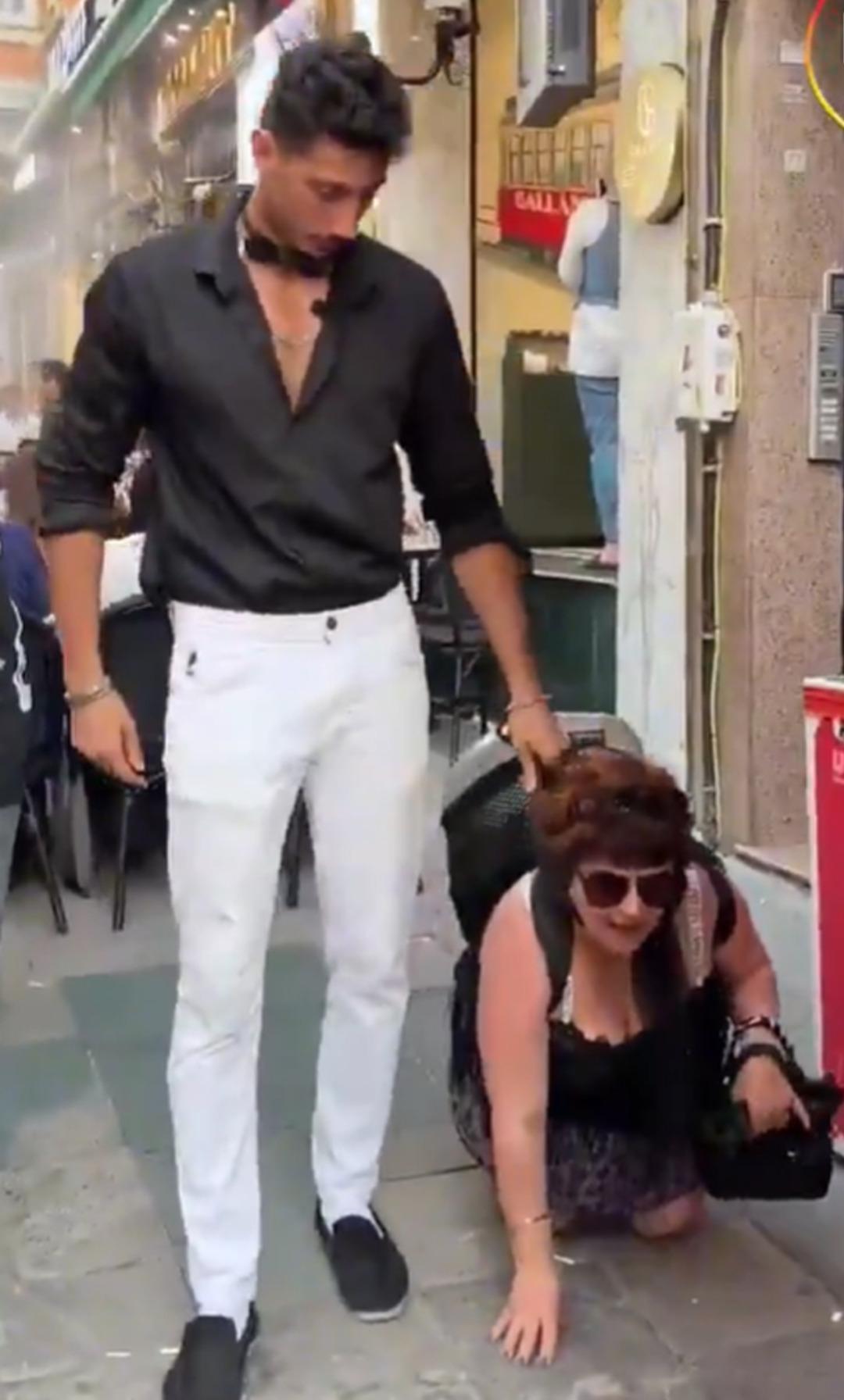 Görüntülerde bir erkeğin, bir kadına tasma takarak sokakta gezdirdiği, kadının ise “miyavlayarak” yerde süründüğü görüldü.