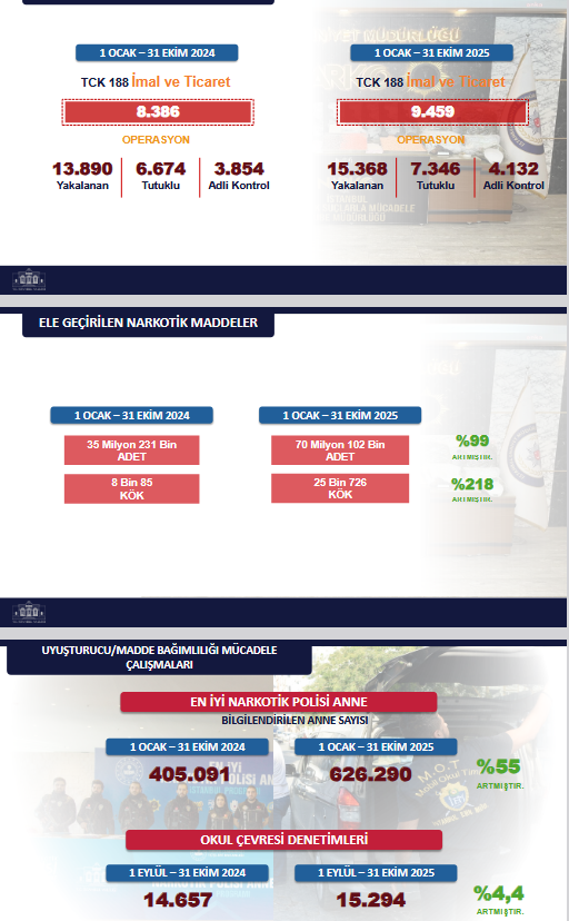 UYUŞTURUCUDA ARTIŞUyuşturucu madde imalatı ve ticaretine yönelik operasyon sayısı 8 bin 386’dan 9 bin 459’a yükseldi. Yakalanan kenevir adedi iki katına çıktı. Ele geçirilen kök sayısı 8 bin 85’ten 25 bin 726’ya ulaştı.