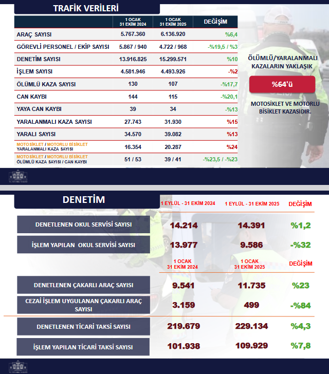 TRAFİK KAZALARI VERİLERİTrafik kazalarında hayatını kaybeden kişi sayısı 144’ten 115’e gerileyerek yüzde 20 oranında düştü. Yaya ölümlerinde de yüzde 13’lük bir azalma yaşandı. Öte yandan yaralanmalı kaza sayısı yüzde 15 arttı. Özellikle motosiklet kazalarında can kayıplarında yüzde 23 oranında düşüş gözlendi.