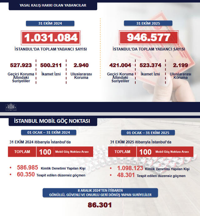 31 Ekim 2024'ten 31 Ekim 2025'e kadar olan verilerin değişimi İstanbul Valiliği'nin aktardığına göre şöyle: