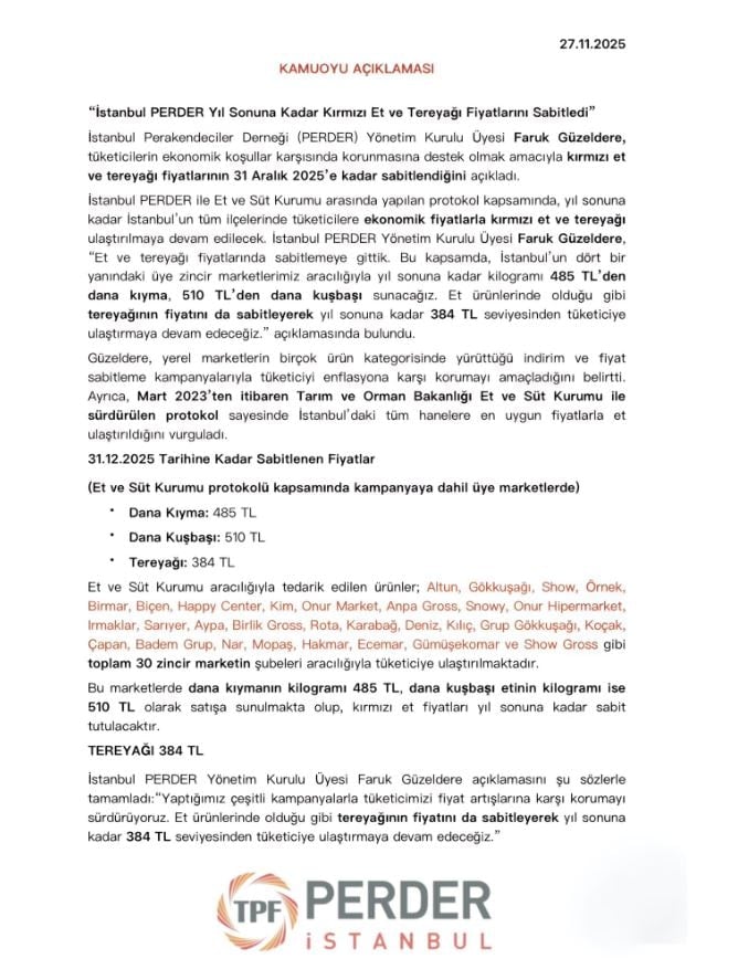 İstanbul Perakendeciler Derneği (PERDER) Yönetim Kurulu Üyesi Faruk Güzeldere, tüketiciyi ekonomik koşullara karşı korumak amacıyla kırmızı et ve tereyağında yıl sonuna kadar fiyatların sabitlendiğini duyurdu. Buna göre kıymanın kilosu 485 lira, kuşbaşı etin kilosu ise 510 lira olarak 31 Aralık’a kadar değişmeyecek.