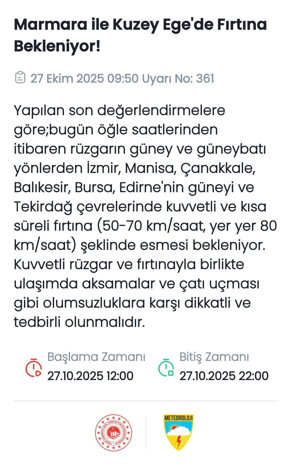 "Yapılan son değerlendirmelere göre; bugün öğle saatlerinden itibaren rüzgarın güney ve güneybatı yönlerden İzmir, Manisa, Çanakkale, Balıkesir, Bursa, Edirne'nin güneyi ve Tekirdağ çevrelerinde kuvvetli ve kısa süreli fırtına (50-70 km/saat, yer yer 80 km/saat) şeklinde esmesi bekleniyor. Kuvvetli rüzgar ve fırtınayla birlikte ulaşımda aksamalar ve çatı uçması gibi olumsuzluklara karşı dikkatli ve tedbirli olunmalıdır."
