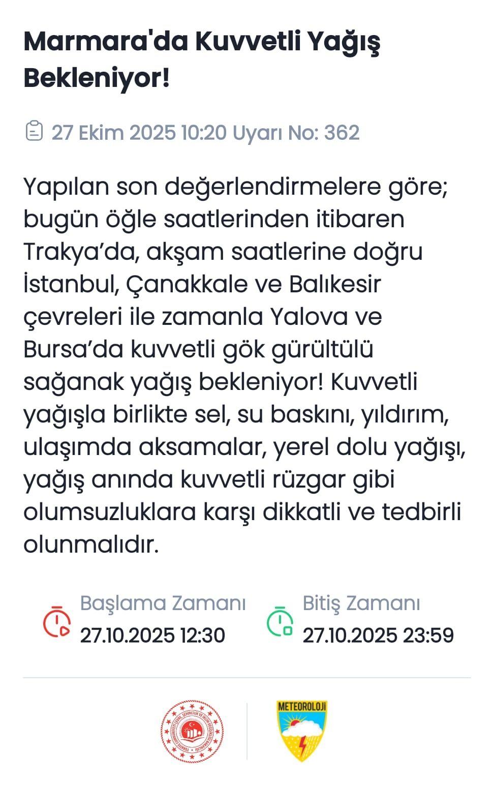 "Yapılan son değerlendirmelere göre; bugün öğle saatlerinden itibaren Trakya'da, akşam saatlerine doğru İstanbul, Çanakkale ve Balıkesir çevreleri ile zamanla Yalova ve Bursa'da kuvvetli gök gürültülü sağanak yağış bekleniyor! Kuvvetli yağışla birlikte sel, su baskını, yıldırım, ulaşımda aksamalar, yerel dolu yağışı, yağış anında kuvvetli rüzgar gibi olumsuzluklara karşı dikkatli ve tedbirli olunmalıdır."