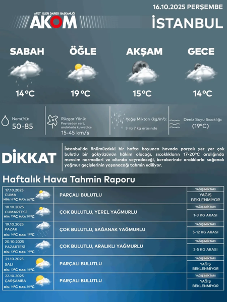 SALI GÜNÜ KARA BULUTLAR YERİNİ GÜNEŞE BIRAKACAKAfet Koordinasyon Merkezi (AKOM) tarafından yayımlanan haftalık hava tahmin raporuna göre, İstanbul’da yağışlar 20 Ekim Pazartesi gününe kadar sürecek. Rapor, yağışların sonrasında yerini parçalı bulutlu havaya bırakacağını belirtti.
