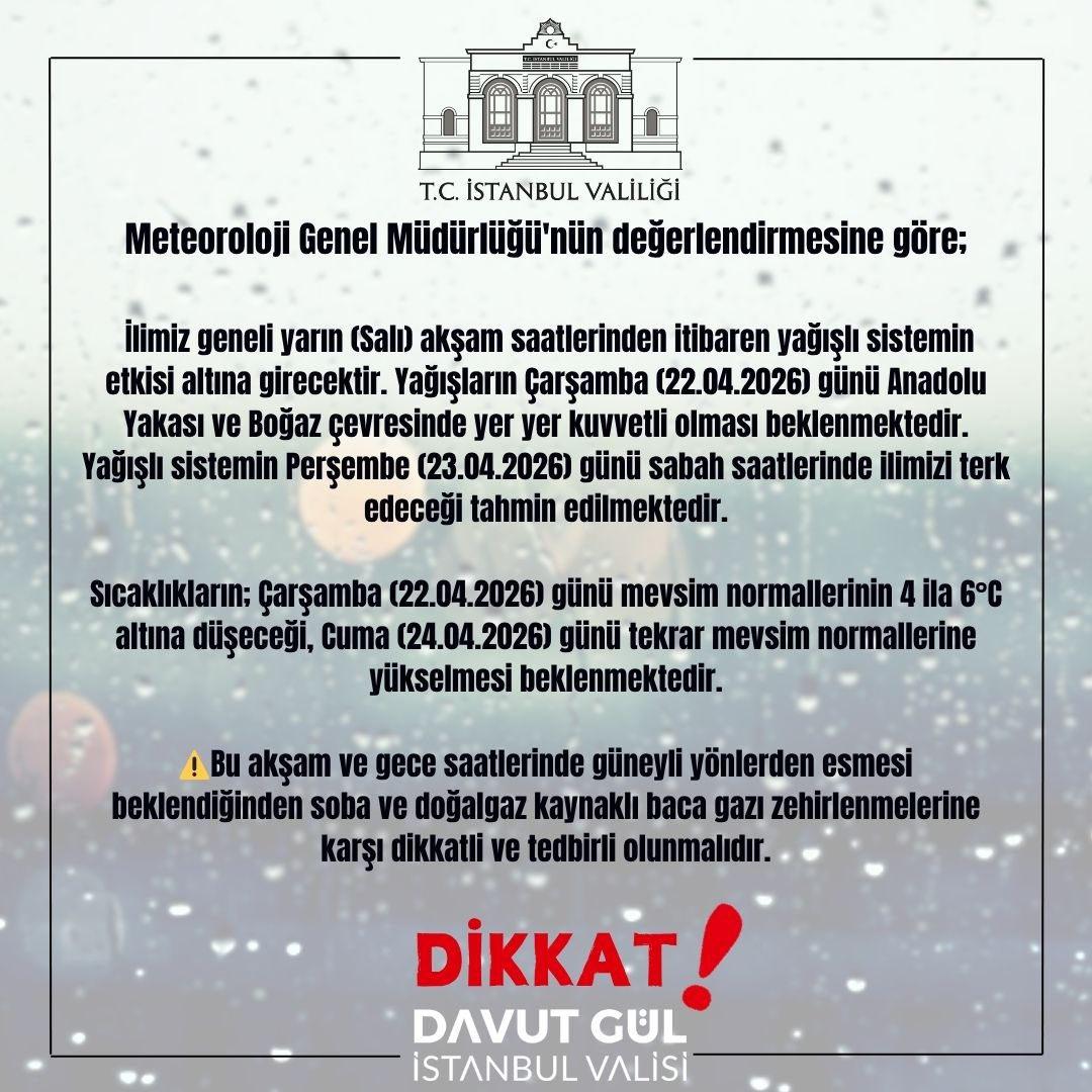İstanbul Valiliğin sosyal medya hesabından yapılan açıklamada, Meteoroloji Genel Müdürlüğünün değerlendirmesine göre, il genelinin yarın akşam saatlerinden itibaren yağışlı sistemin etkisi altına girileceği belirtildi.