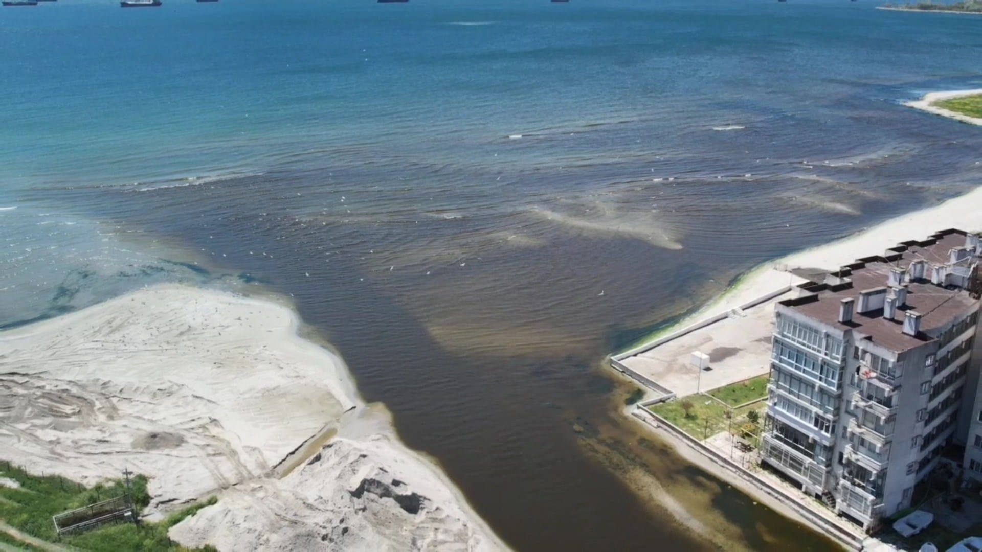 Rengi kahverengiye dönen derenin denizle buluştuğu alan, dron ile havadan görüntülendi.