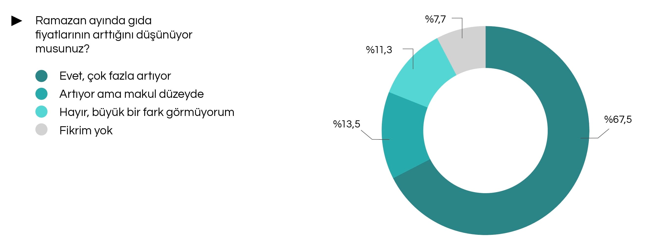 Araştırmada İstanbullulara yaklaşan Ramazan ayı ve gıda fiyatları da soruldu. Katılımcıların yüzde 67,5’i gıda fiyatlarının bu dönemde belirgin şekilde arttığını ifade etti. Gıda harcamalarının arttığını söyleyenlerin oranı yüzde 46,3 olurken; fiyatların makul düzeyde arttığını düşünenler sadece yüzde 13,5’te kaldı. Halkın yüzde 11,3’ü ise fiyatlarda bir değişim olmadığını savundu.