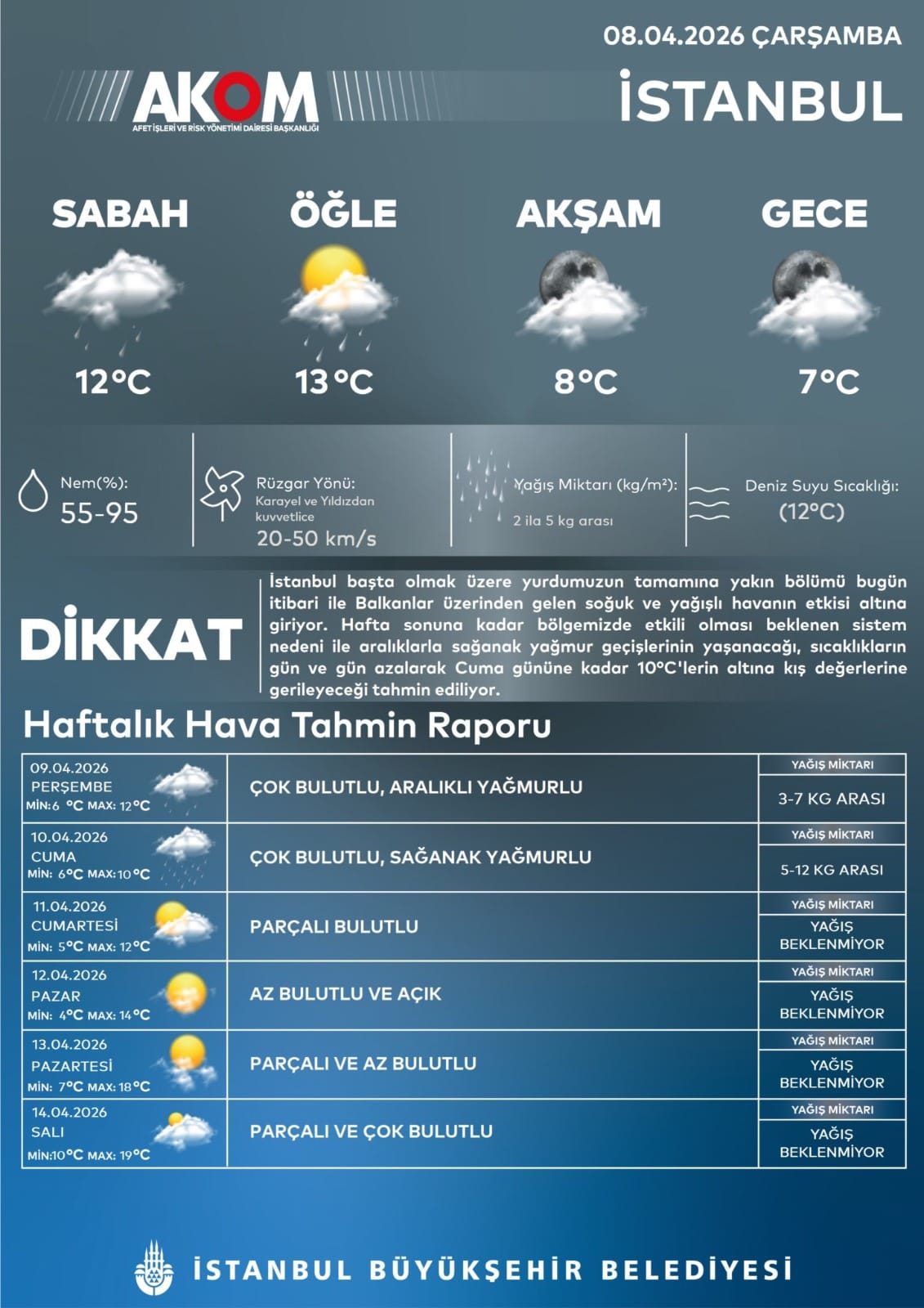 İstanbul Büyükşehir Belediyesi Afet Koordinasyon Merkezi (AKOM), hava tahmin raporunu açıklayarak İstanbul için uyarılarda bulundu. İstanbullular baharı beklerken İstanbul’da Balkanlar üzerinden gelen soğuk ve yağışlı havanın etkili olacağını duyuran AKOM, şehirde bugün (8 Nisan) gün boyunca aralıklarla yağmur beklendiğine dikkat çekti.