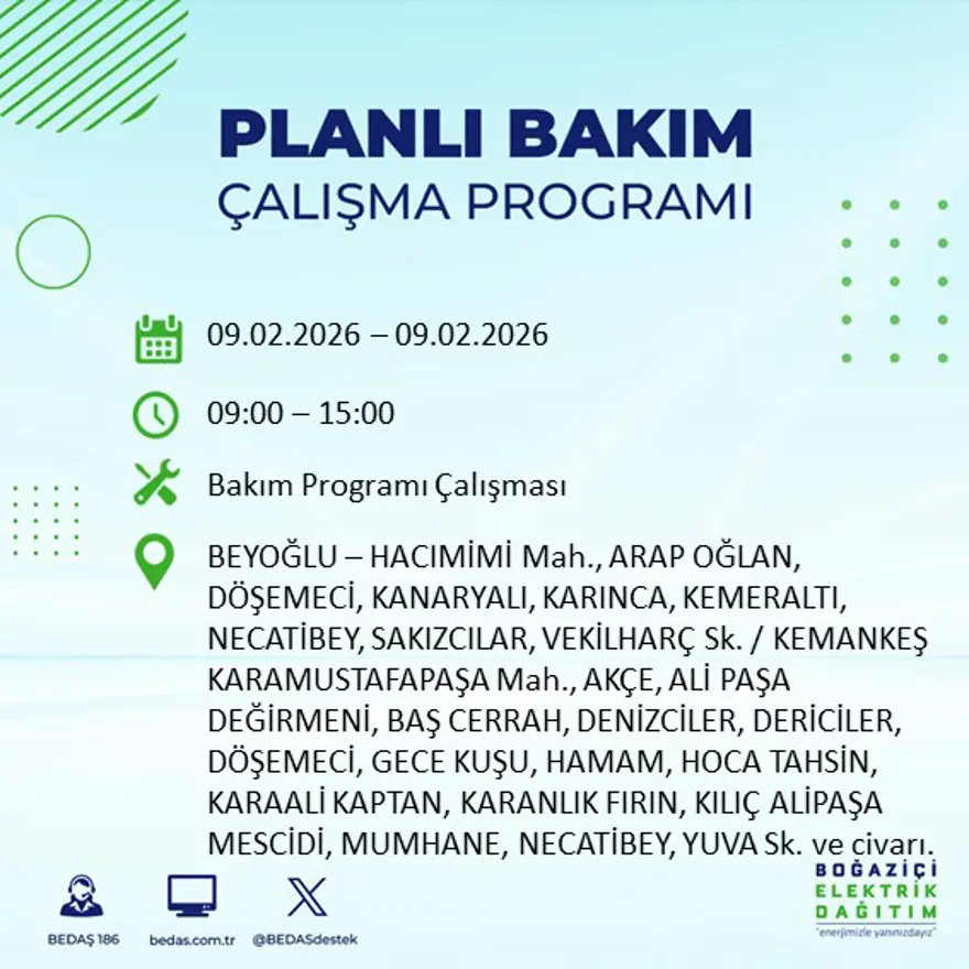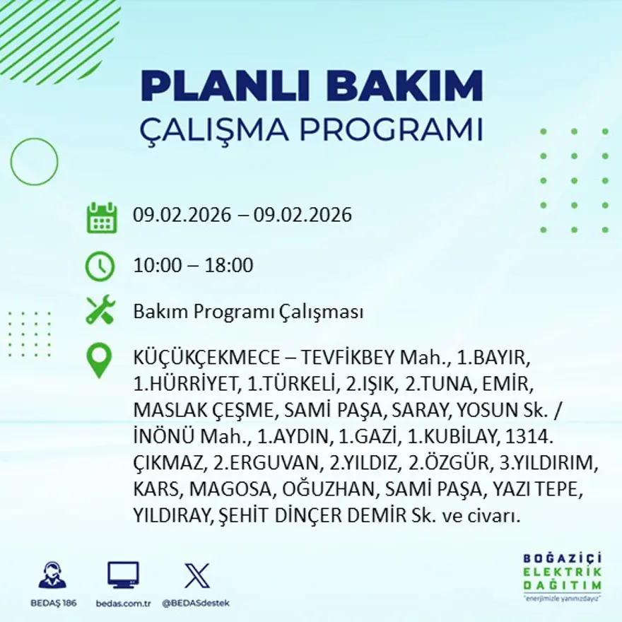 9 ŞUBAT’TA İSTANBUL’DA ELEKTRİK KESİNTİSİ OLACAK MI?BEDAŞ’ın paylaştığı planlı kesinti takvimine göre, 9 Şubat 2026 tarihinde İstanbul’un çeşitli ilçelerinde, belirlenen saat dilimlerinde elektrik kesintileri uygulanacak. İlçe ve mahalle bazında yapılacak çalışmaların tamamlanmasının ardından elektriğin kademeli olarak yeniden sağlanacağı belirtildi.