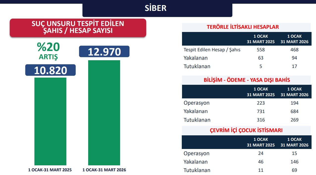Siber suçlarla mücadelede geçen yıla göre yüzde 20 artış kaydedildi. 12 bin 970 hesapta suç unsuru tespit edildi. Terörle iltisaklı olduğu belirlenen 17 bilişim, ödeme ve yasadışı bahis ile çevrimiçi çocuk istismarı kapsamında 69 kişi tutuklandı.