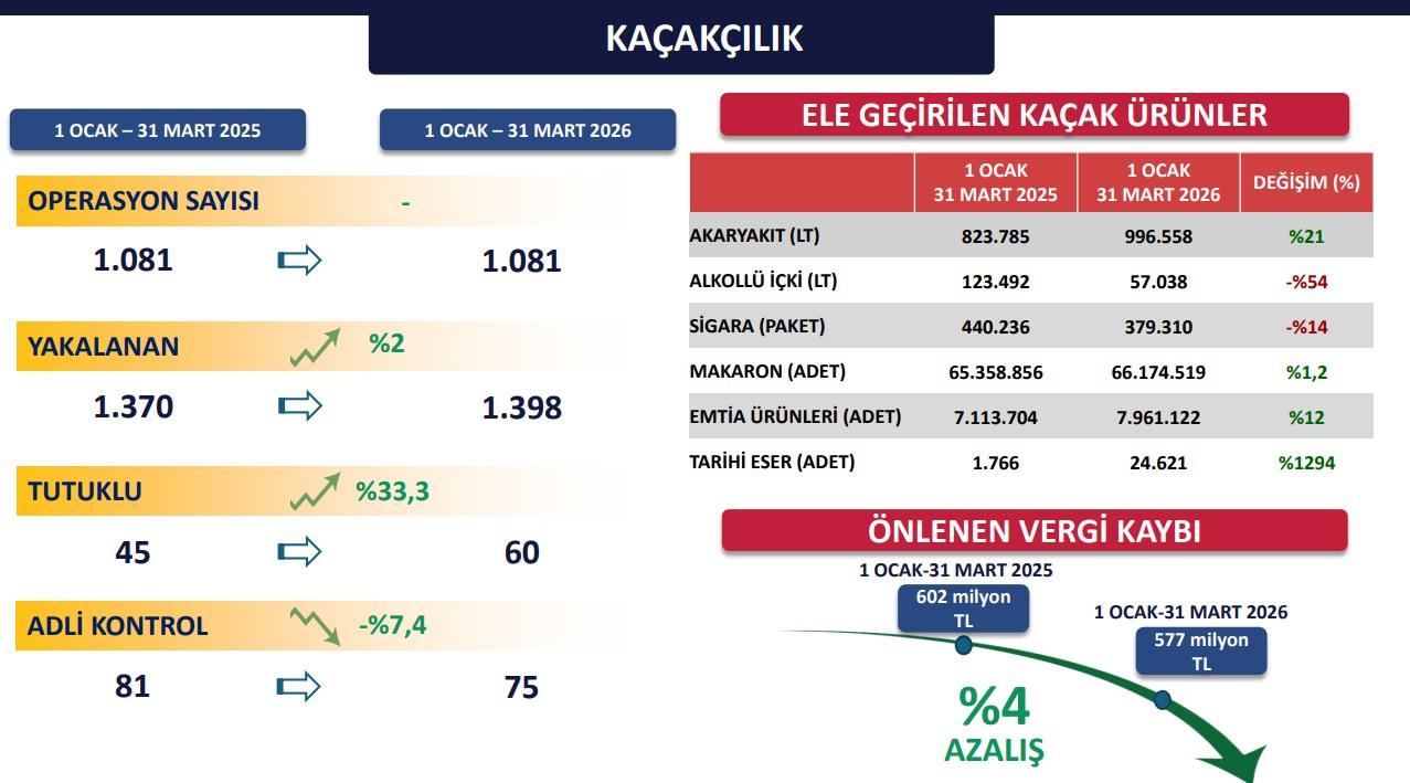 Kaçakçılık suçlarına yönelik 1.081 operasyon düzenlendi. Bu operasyonlarda 996 bin 558 litre kaçak akaryakıt, 57 bin 38 litre kaçak alkollü içki ve 379 bin 310 paket kaçak sigara ele geçirildi.