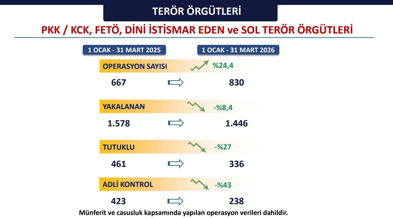 Açıklanan verilere göre, başta PKK ve FETÖ olmak üzere terör örgütlerine yönelik 830 operasyon düzenlendi. Bu operasyonlarda 1.446 kişi yakalanırken, 336 kişi tutuklandı, 238 kişi hakkında ise adli kontrol kararı uygulandı.