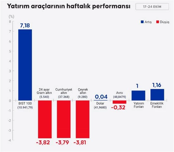 Bu hafta yatırımcıların yüzünü borsa güldürdü, altın ise kayıplarla gündeme geldi. Dövizde sınırlı dalgalanmalar yaşanırken, yatırım fonları ve emeklilik fonları değer kazandı. Altının tahtına kısa süreliğine borsa oturdu.