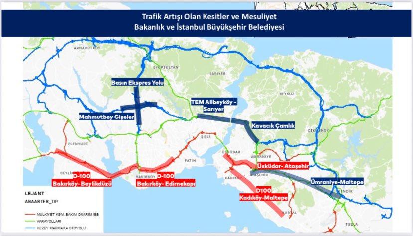 “İstanbul’da trafik kimin sorumluluğunda? İstanbul’da trafiğin en yoğun olduğu ana yolların büyük bölümü Bakanlık/Karayolları sorumluluğundadır; TEM Alibeyköy – Sarıyer, Kavacık – Çamlık, Ümraniye – Maltepe, Basın Ekspres Yolu, Mahmutbey Gişeler, Kuzey Marmara Otoyolu. Buna rağmen AKP’li isimlerin yoğunluğun sebebi olarak İBB’yi işaret etmeleri, ya bilgisizliktir ya da bilinçli bir algı çabasıdır. Aşağıdaki tabloda işaretli alanlar trafiğin yoğunlaştığı bölgeleri göstermektedir.”