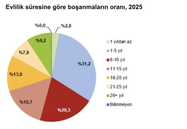BOŞANMA OLAYLARINDAN 191 BİN 371 ÇOCUK ETKİLENDİKesinleşen boşanma davaları sonucunda 2025 yılında 193 bin 793 çift boşanırken 191 bin 371 çocuk velayete verildi. Boşanma davaları sonucu, çocukların velayetinin çoğunlukla anneye verildiği görüldü. Çocukların velayetinin 2025 yılında yüzde 74,6'sı anneye, yüzde 25,4'ü babaya verildi.