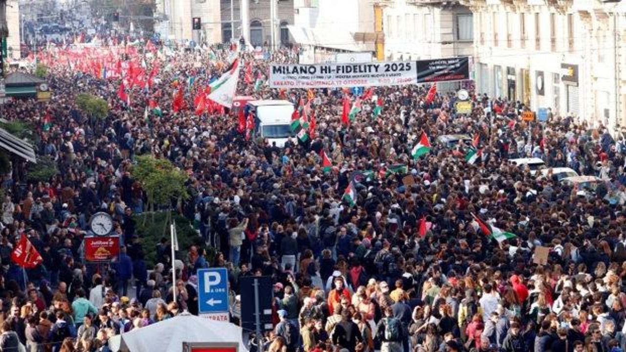 Müsabaka öncesinde Udine'de binlerce kişinin katılımıyla düzenlenen protesto yürüyüşünde, "Filistin'e özgürlük", "İsrail'i boykot et" sloganları atılırken, Filistin bayrakları ve "Özgür Filistin", "Soykırımcı İsrail" yazılı pankartlar taşındı.