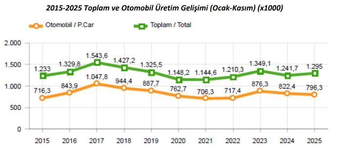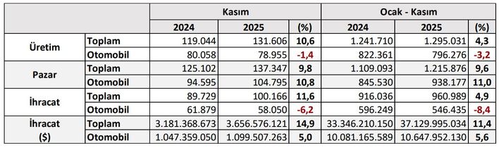 Buna göre, yılın ilk 11 aylık döneminde toplam otomotiv üretimi bir önceki yılın aynı dönemine göre yüzde 4 arttı ve 1 milyon 295 bin 31 adede ulaştı. Otomobil üretimi ise yüzde 3 azalarak 796 bin 276 adet olarak gerçekleşti. Traktör üretimiyle birlikte toplam üretim ise 1 milyon 320 bin 119 adedi buldu.