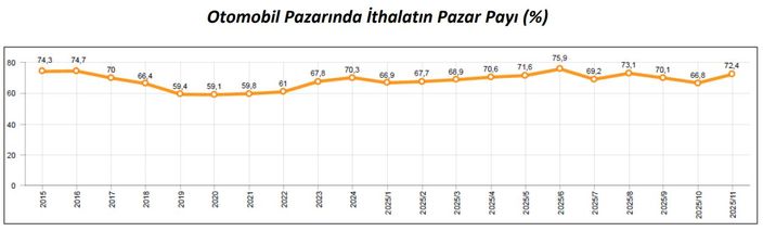 Ekim ayında düşüşe geçen ithal otomobil payı Kasım ayında ise yeniden yükselişe geçti. OSD raporuna göre, ithal araçların payı Eylül'de yüzde 70, Ekim'de yüzde 67, Kasım'da ise yüzde 72.4 olarak ölçüldü.