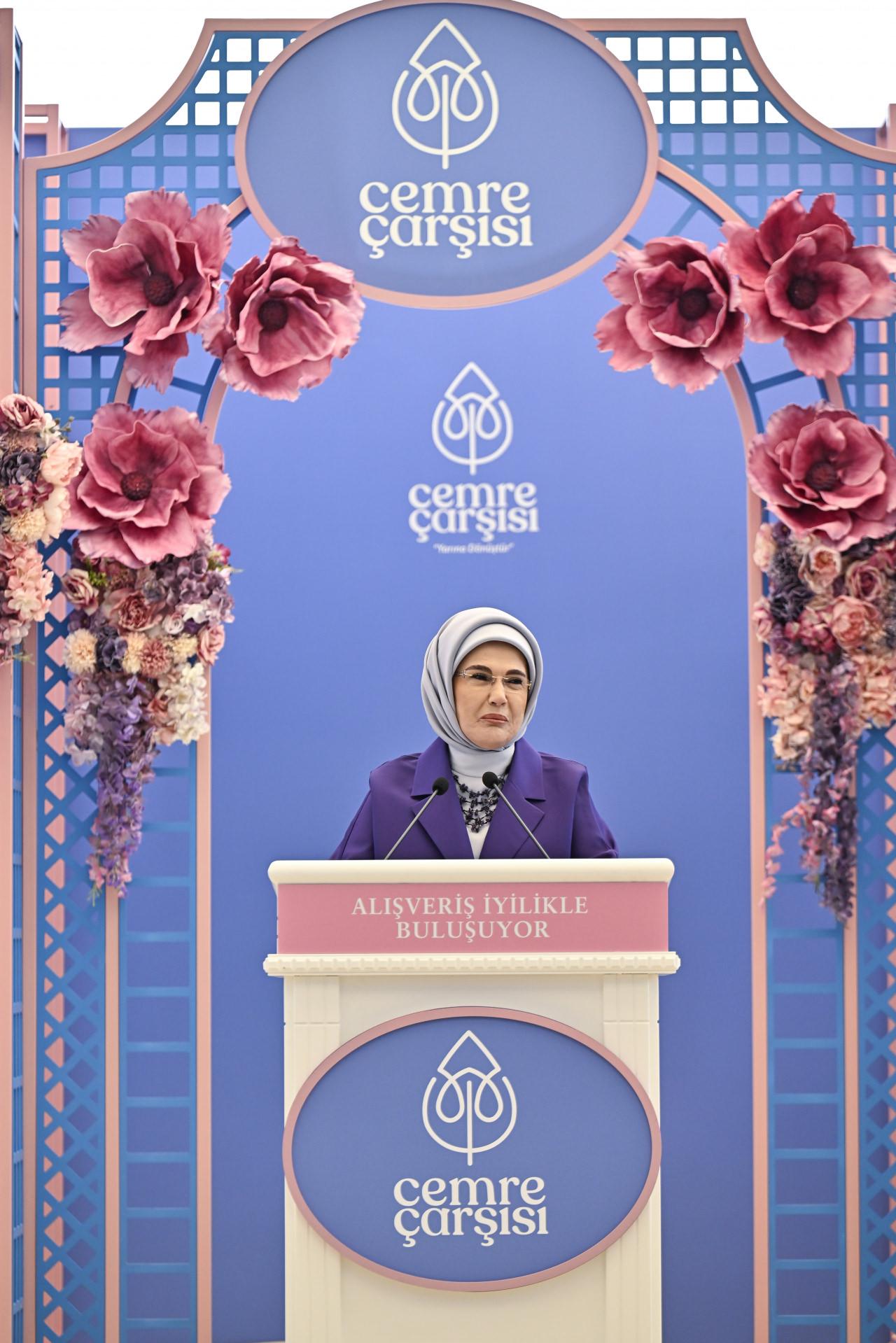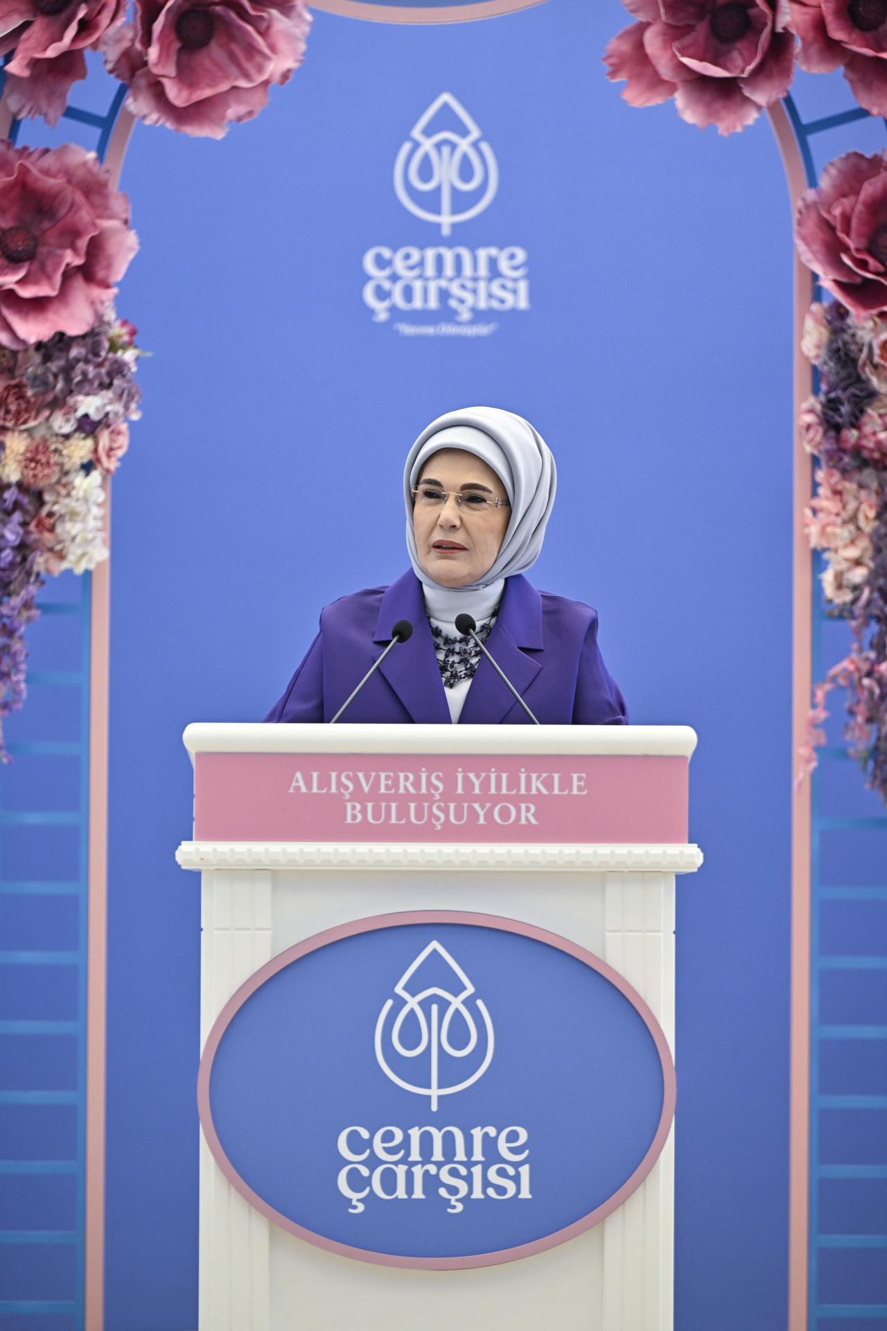 Beyoğlu'ndaki The Peninsula Oteli'nin fuaye alanında kurulan çarşının açılışında konuşan Erdoğan, Cemre Çarşısı'nın iyiliğin cemre olup hayatın manevi toprağına düştüğü hayırlı bir platform olduğunu belirtti.