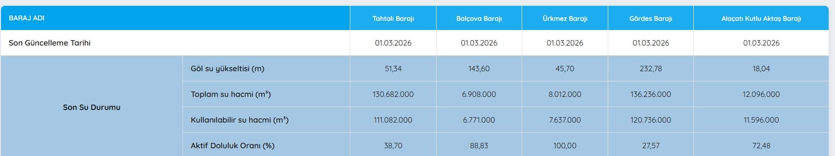 2 MART 2026 İTİBARIYLA İZMİR BARAJLARINDA SON DURUMİzmir Su ve Kanalizasyon İdaresi tarafından açıklanan verilere göre İzmir’in baraj doluluk oranları şöyle kaydedildi: