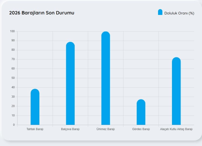 • Tahtalı Barajı: %38,70• Balçova Barajı: %88,83• Ürkmez Barajı: %100,00• Gördes Barajı: %27,57• Alaçatı Kutlu Aktaş Barajı: %72,48Veriler, bazı barajlarda yüksek doluluk oranı gözlemlenirken, özellikle Gördes ve Tahtalı Barajı’nda rezervlerin hâlâ sınırlı seviyelerde kaldığını gösteriyor. Bu tablo, su yönetimi ve planlamanın önemini bir kez daha ortaya koydu.