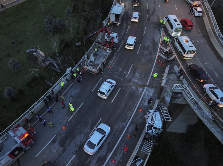 İzmir de feci kaza! İş makinesi yüklü tır viyadükten düştü, yaralılar var