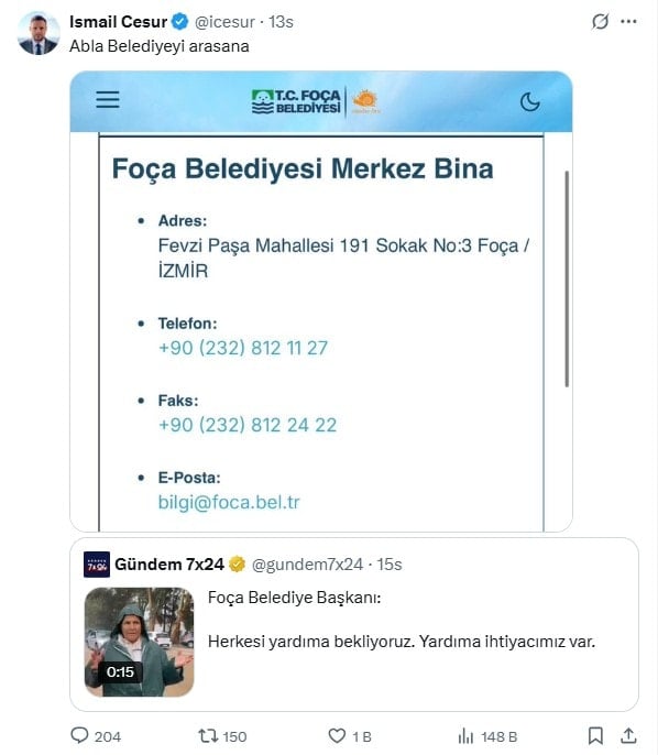 Cesur, Foça Belediyesi'nin iletişim numarasını paylaşarak "Abla belediyeyi arasana" diye CHP'li Başkan Fıçı'ya göndermede bulundu.