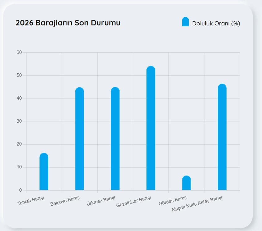 Tahtalı Barajı: %16,34Balçova Barajı: %44,91Ürkmez Barajı: %45,05Güzelhisar Barajı: %54,22Gördes Barajı: %6,42Alaçatı Kutlu Aktaş Barajı: %46,44