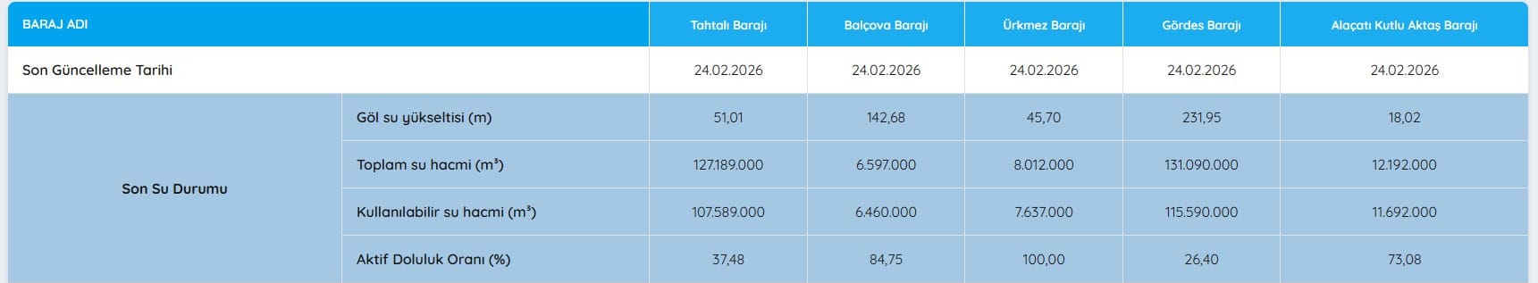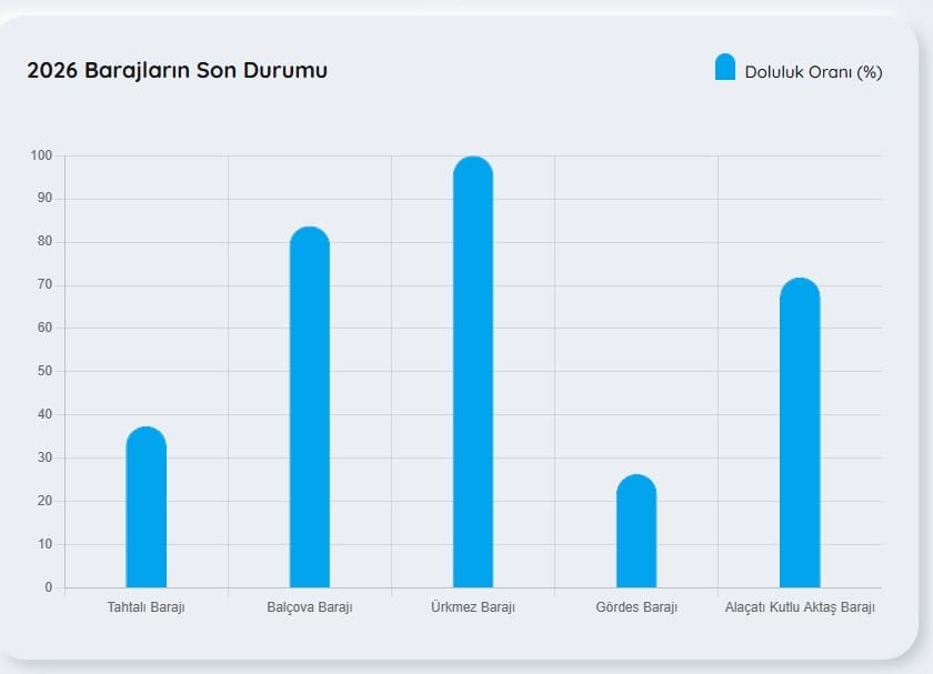 Tahtalı Barajı: %37,48Balçova Barajı: %84,75Ürkmez Barajı: %100,00Gördes Barajı: %26,40Alaçatı Kutlu Aktaş Barajı: %73,08ÜRKMEZ BARAJI TAM DOLULUĞA ULAŞTIÜrkmez Barajı’nın yüzde 100 doluluğa ulaşması, İzmir için önemli bir gelişme anlamına geliyor.