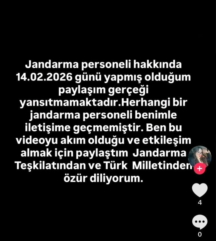 Amacının 'etkileşim' olduğunu belirten genç kız, "Jandarma personeli hakkında 14.02.2026 günü yapmış olduğum paylaşım gerçeği yansıtmamaktadır. Herhangi bir jandarma personeli benimle iletişime geçmemiştir. Ben bu videoyu akım olduğu ve etkileşim almak için paylaştım. Jandarma teşkilatından ve Türk milletinden özür diliyorum" şeklinde açıklama yaptı.