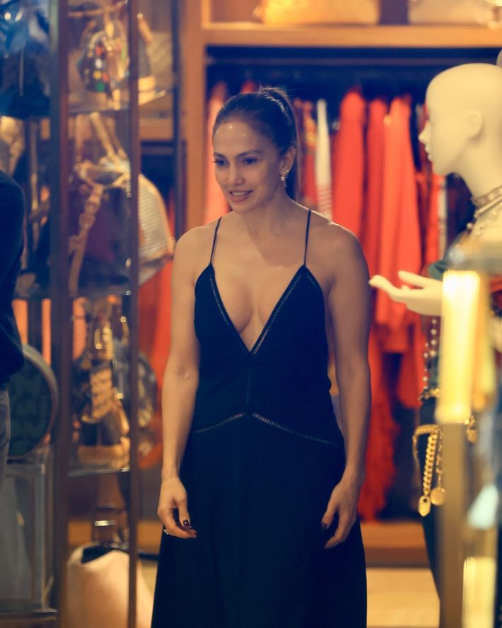 Lopez, alışverişe, derin göğüs dekolteli, sırtı açık bir elbiseyle çıkmayı tercih etmişti.