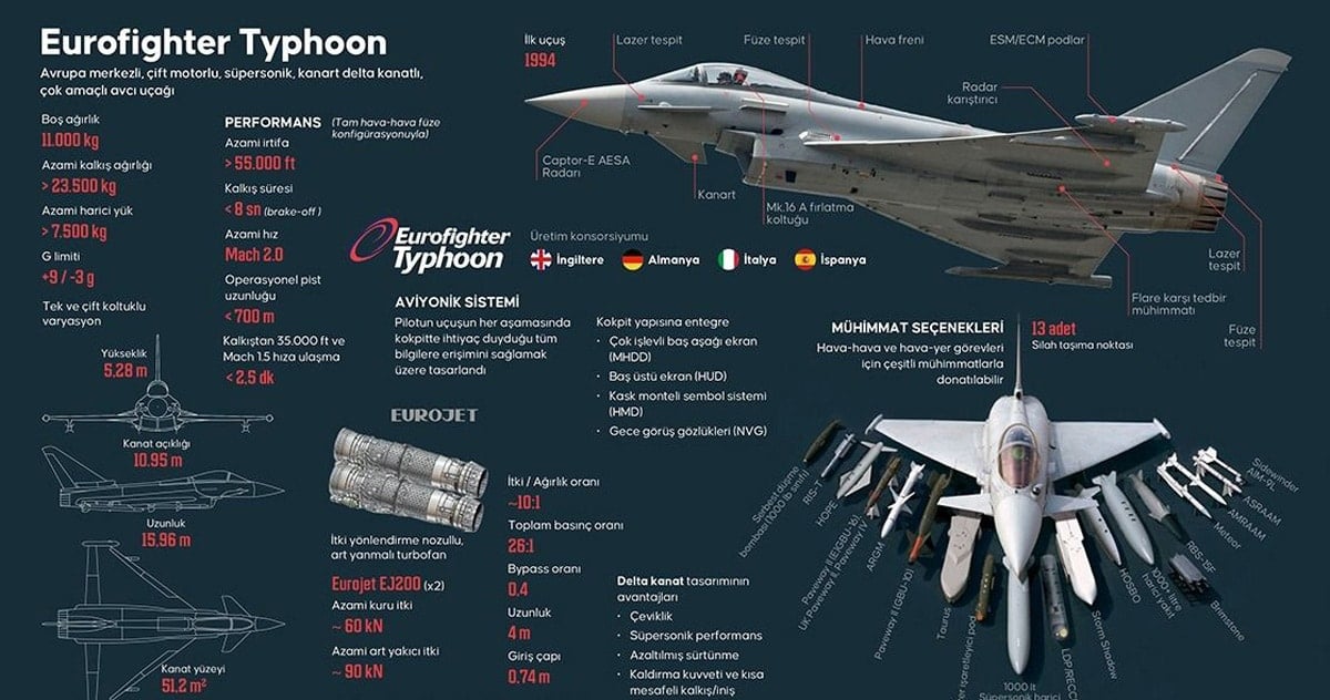 Türkiye, İngiltere’den 20 Eurofighter (EF) savaş uçağı almak için anlaşmayı yaptı. Milli Savunma Bakanı Yaşar Güler, 20 uçak ve mühimmatı için 5.4 milyar İngiliz sterlini (318 milyar TL) ödeneceğini açıkladı. Ödemeler yılık taksitlere bölünecek. 110 Türk pilot ve teknisyeni İngiltere’de eğitilecek. Uçakların yedek parçalarının üretim ve teslimi de İngiliz şirketlerince güvence altına alındı. 27 milimlik top, bomba kitleri ve Meteor, Harpoon, Penguin gibi 19 ayrı füze monte edilebilen uçakların fiyatı ekipmanlarına göre değişiyor. İYİ Parti Grup Başkanvekili Turhan Çömez’in önergesine detaylı bilgi veren Güler, “Maliyet muadil uçaklar ve Eurofighter’ı tedarik eden diğer ülkelerle benzer seviyede” dedi.