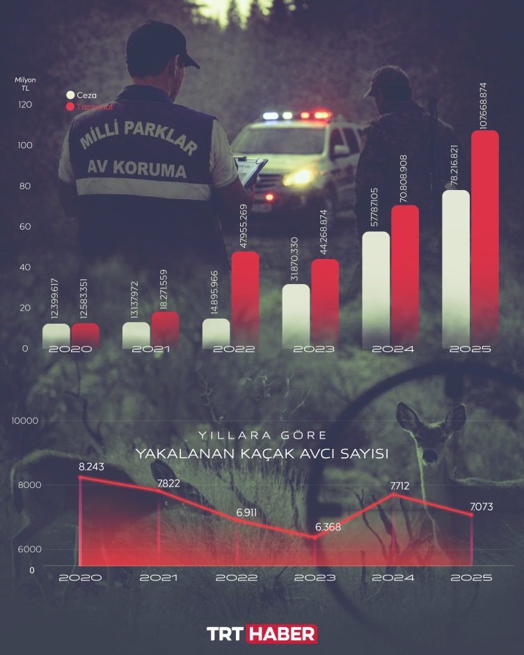 2003-2025 yılları arasında 123 bin 342 kişiye kaçak avcılık nedeniyle 268 milyon 880 bin lira idari para cezası uygulandı. Bunlardan 29 bin 942 kişi de toplam 4 milyar 180 milyon lirayı aşan tazminat ödemek zorunda kaldı.