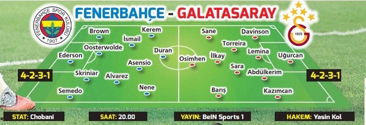 Galatasaray'ın başına geçtiği günden bu yana Kadıköy’de mağlubiyeti bulunmayan (3G, 1B) Okan Buruk yine 3 puan hesapları yapıyor. Sakat ve cezalı futbolcuların çokluğu tecrübeli hocayı zor durumda bırakırken, özellikle sağ bekte kriz yaşıyordu. Sallai cezalı, Kaan ve Singo da sakat. Buruk çareyi Davinson’u bu bölgeyi çekmekte buldu. Stoperde Lemina’yı kullanacak olan başarılı çalıştırıcı mecburiyetten böyle bir değişikliğe başvurdu.