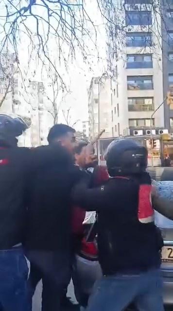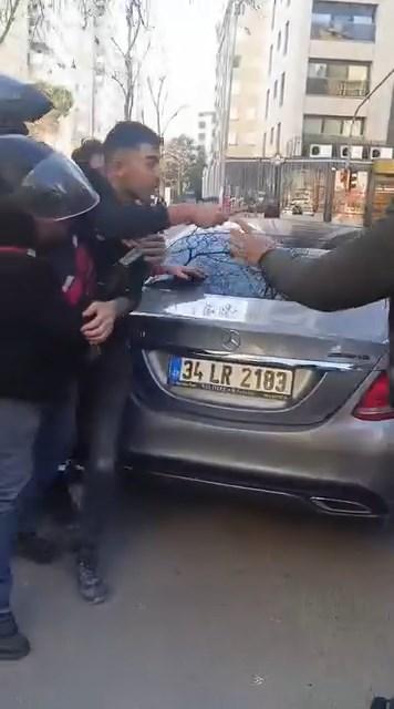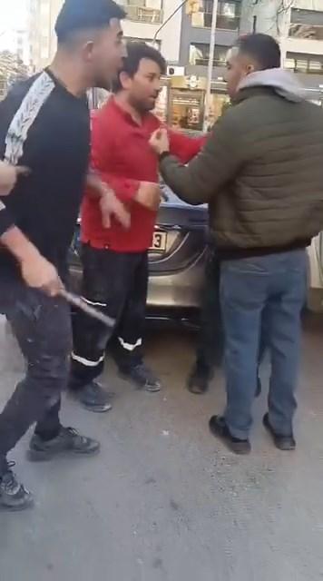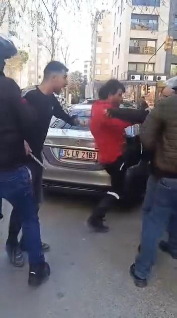 Otomobilden inen sürücü ve yanındakiler kamyonete tekme atarken, ellerindeki demir çubuklarla kamyonet şoförüne saldırdı. Taraflar arasında yaşanan kavga çevredeki vatandaşların araya girmesiyle sona erdi.
