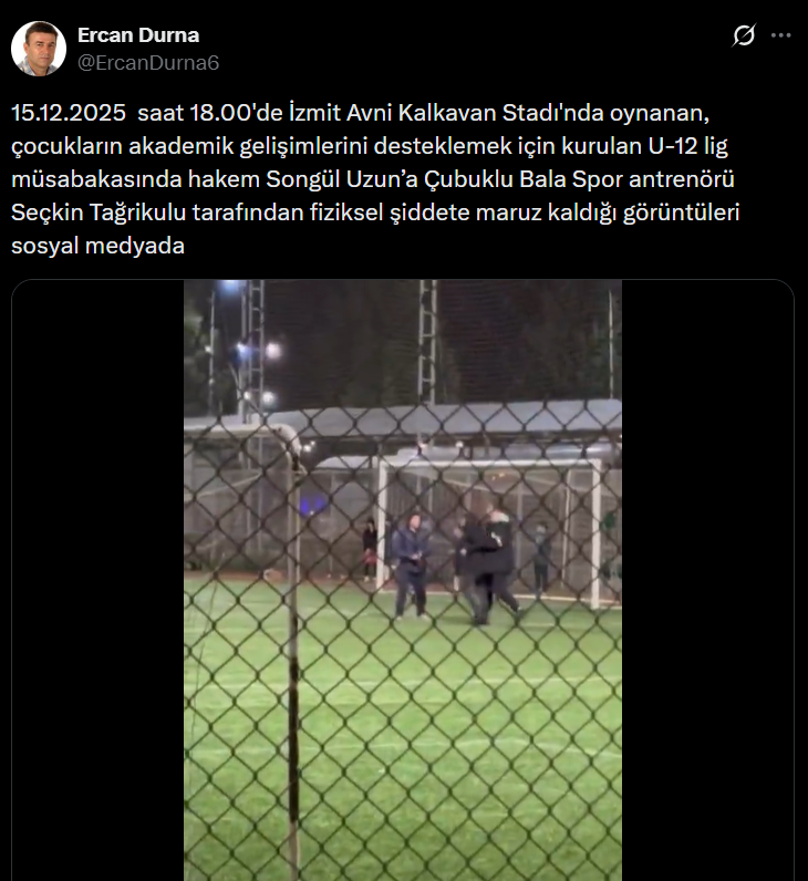 Ercan Durna'nın paylaşımına göre; Çubuklu Bala Spor antrenörü Seçkin Tanrıkulu, kadın hakem Songül Uzun'a saldırdı.