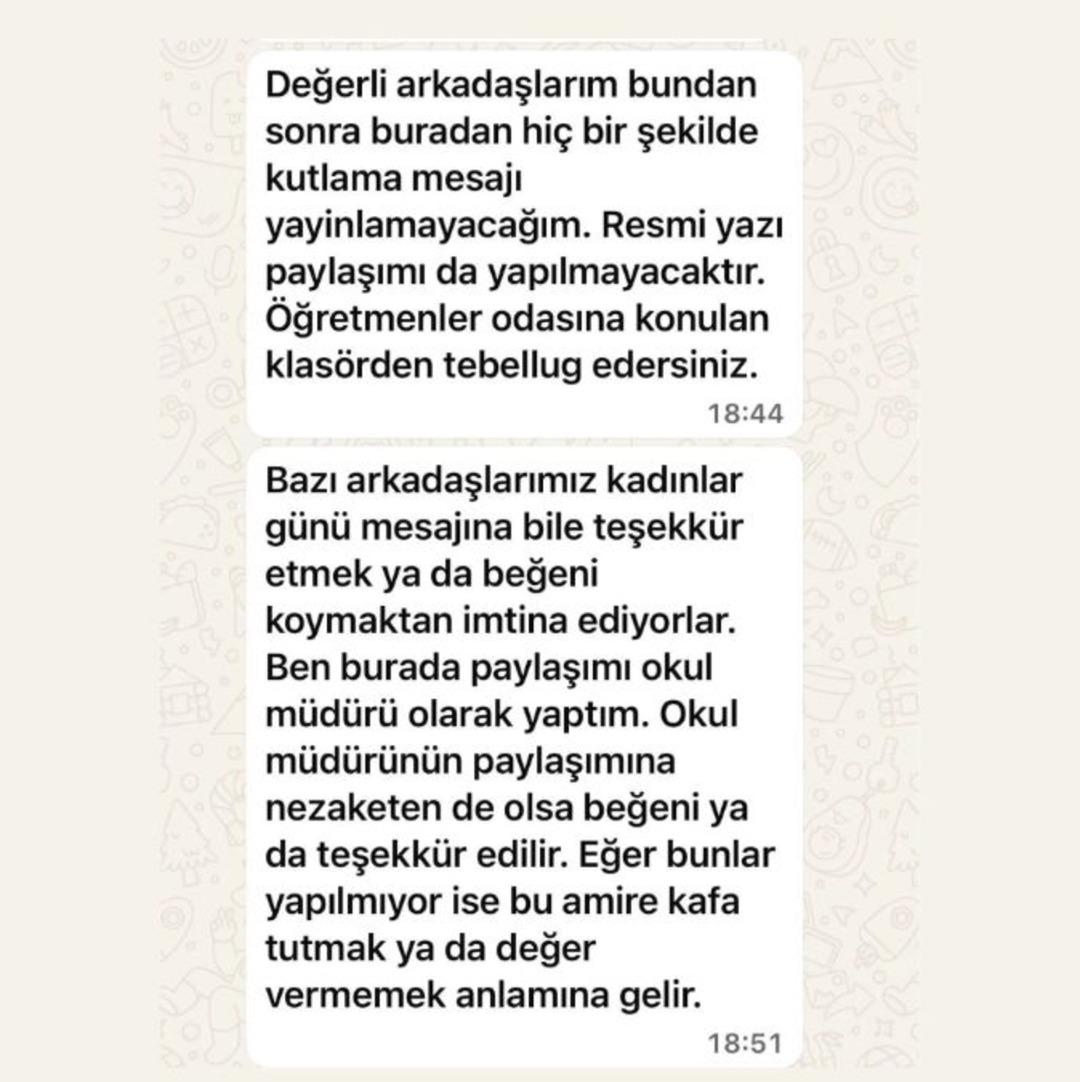 Murat K., WhatsApp grubuna yazdığı mesajlarda da "Okul müdürünün paylaşımına nezaketen de olsa beğeni ya da teşekkür edilir. Eğer bunlar yapılmıyor ise bu amire kafa tutmak ya da değer vermemek anlamına gelir" şeklinde ifadeler de kullandı.