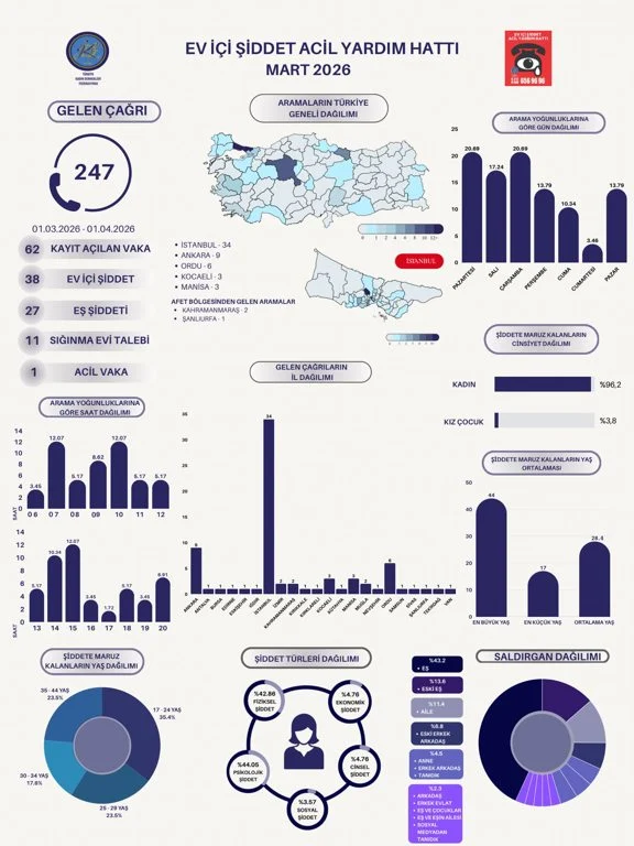 1-31 Mart 2026 tarihleri arasında Ev İçi Şiddet Acil Yardım Hattı’na toplam 247 çağrı yapıldığı bildirildi.