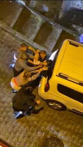 Tartışmanın büyümesi üzerine sokağa inen bina sakinleri sürücüye tekme ve yumruklarla saldırdı.Boğazı sıkılan sürücünün başı da hatalı park edilen hafif ticari aracın camına vuruldu. Darbedilen sürücünün babasına ve arkadaşlarına haber vermesi üzerine sokaktaki kavga daha da büyüdü. Tekmeli yumruklu kavganın taraflarını çevredeki vatandaşlar araya girerek ayırdı. Yaşananlar cep telefonu kamerasına yansıdı. Olayın ardından sokaktan uzaklaşan tarafların birbirlerinden şikayetçi olmadığı öğrenildi. Hafif ticari aracın sahibine ise ulaşılamadığı öğrenildi.